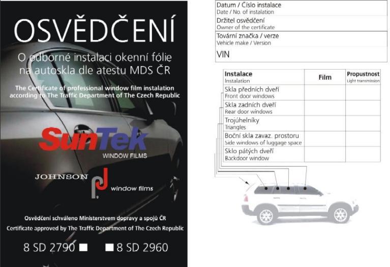 Ke každé instalaci vydáváme Osvědčení o odborné instalaci okenní fólie + atest pro případnou kontrolu Policií ČR nebo na STK.